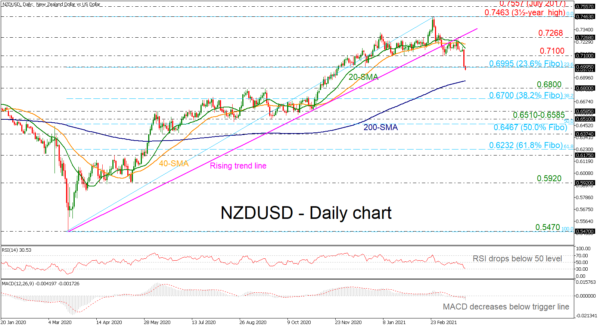 The price is currently flirting with the 23.6% Fibonacci retracement level of the upward wave from 0.5470 to 0.7463 at 0.6995. A continuation of the drop below this line could take the price towards the 200-day simple moving average (SMA) at 0.6867 and then near the 0.6800 handle. Steeper decreases could meet the 38.2% Fibonacci level of 0.6700.