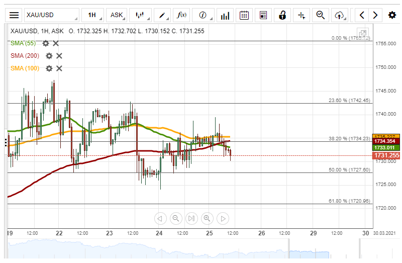 Since the start of Wednesday’s trading, the yellow metal has been trading between the 1,730.00 and 1,740.00 levels. In the meantime, the price is being slightly impacted by the hourly simple moving averages and the Fibonacci retracement levels of the March 18 high and the March 12 low levels.
