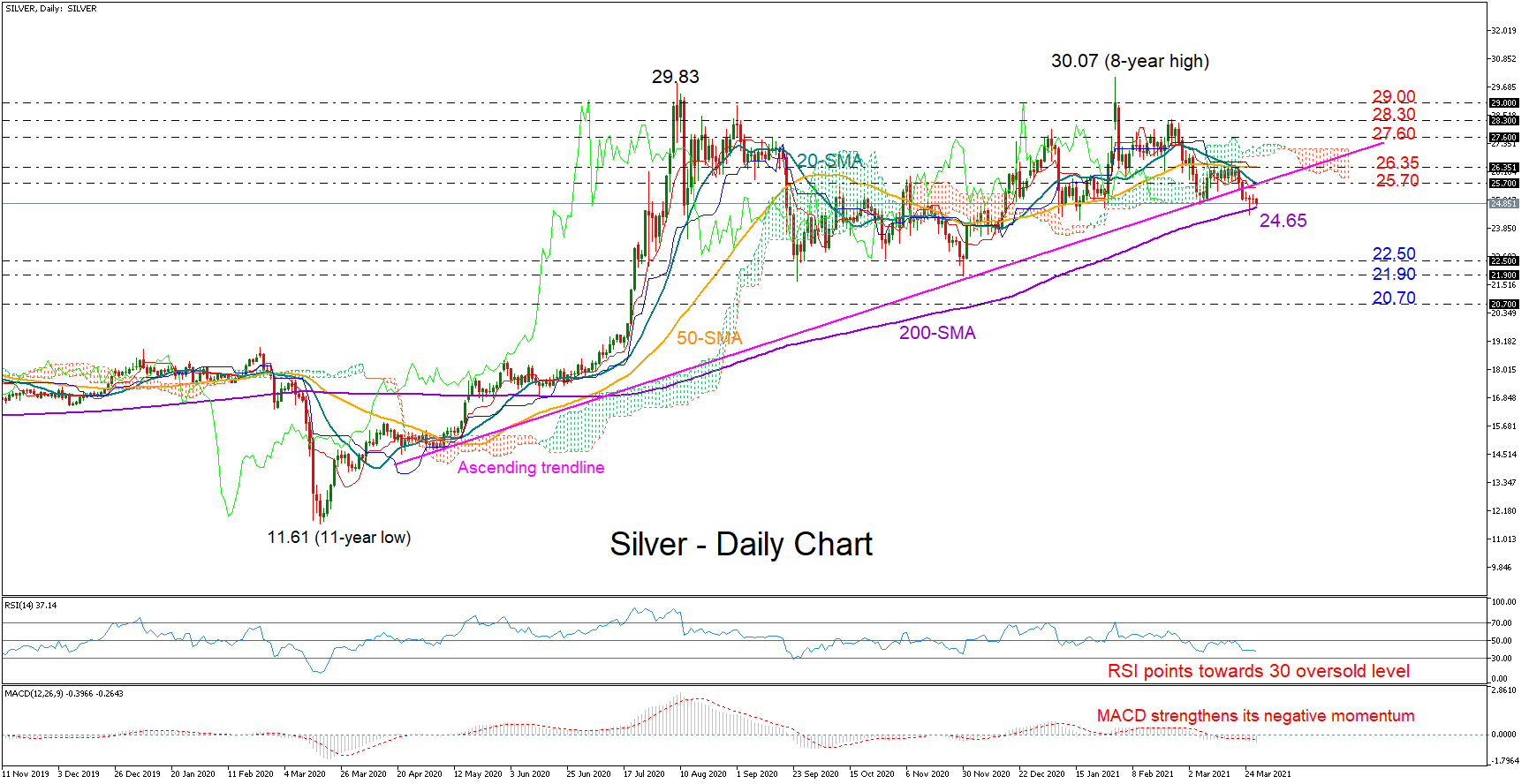 That said, the above signals could prove false if the white metal manages to bounce on the 200-day SMA and close back above the trendline and the 20- and 50-day SMAs seen at 25.70 and 26.35, respectively. Higher, the bulls may need to climb above the Ichimoku cloud at 27.60 to access the key zone of 28.30 – 29.00.