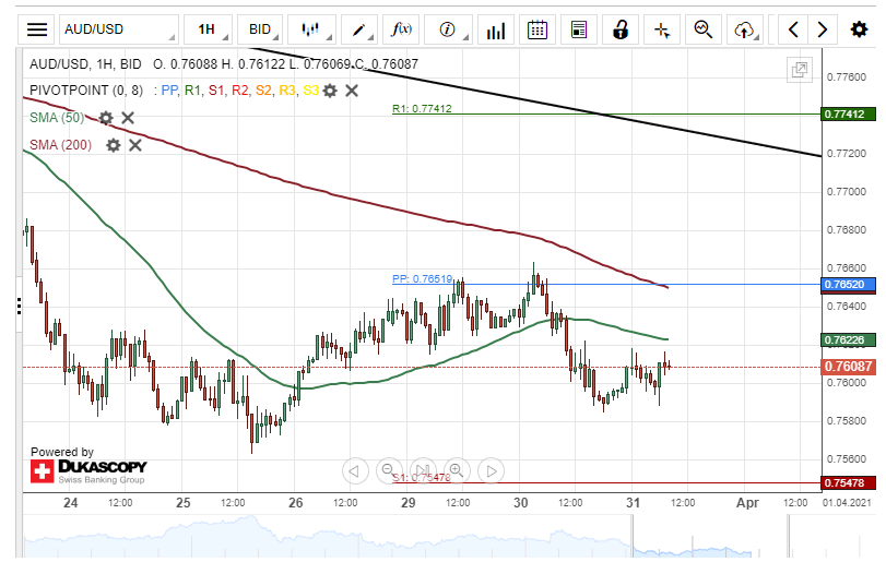 The Australian Dollar declined by 72 pips or 0.94% against the US Dollar on Tuesday. The currency pair breached the 50– hour simple moving average during yesterday’s trading session.