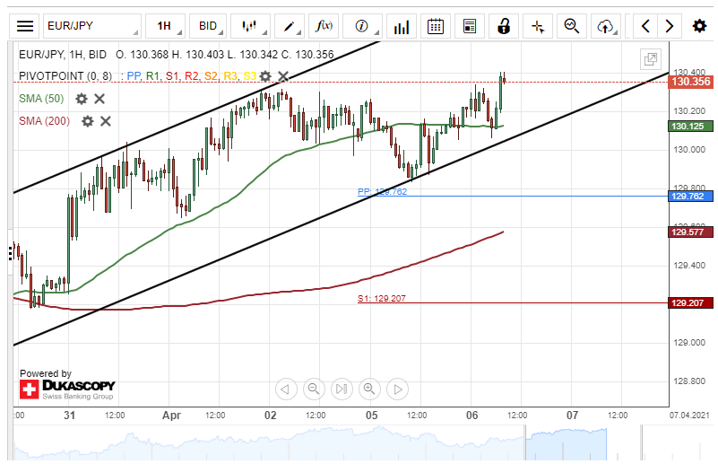 If the breakout occurs, a decline towards the weekly pivot point at 129.76 could be expected today.