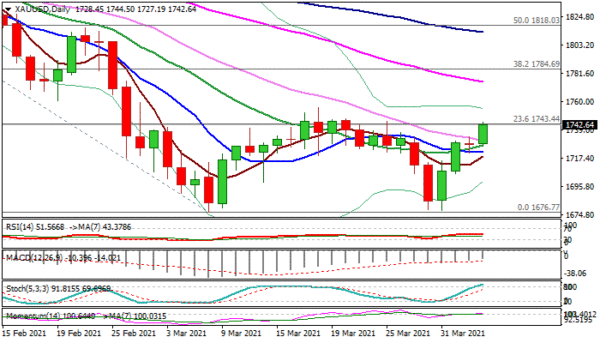 Momentum indicator on daily chart broke into positive territory and support the action, but recovery could lose traction if bulls fail to clear $1755 pivot that would keep near-term action in the extended range.