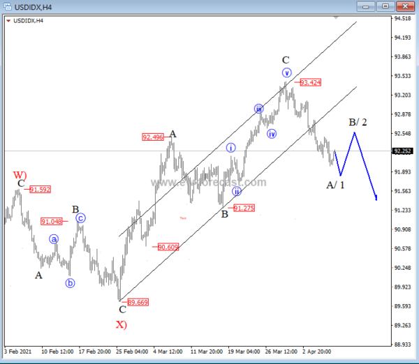 DXY has been recovering through the month of March but now the USD seems to be turning south after a decisive break below the trendline support connected up from 89.66 level. We see that turn very sharp and impulsive so it’s an important structure that suggests more weakness is coming; ideally, after wave B/2 rally that may occur in the near term. Resistance for a bounce is at 92.50, followed by 92.80 levels from where a new drop will be expected while the invalidation level at 93.42 must not be breached.