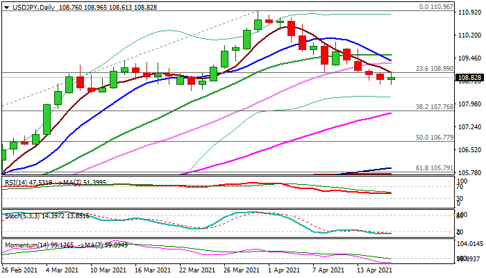 Bears eye immediate support at 108.40 (Mar 23 trough), violation of which would expose key levels at 108.76/68 (Fibo 38.2% of 102.59/110.96 / 55DMA) with break here to open way for deeper pullback.