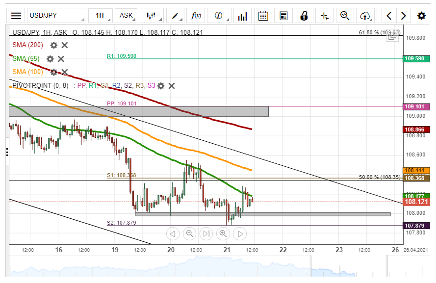 On the other hand, a breaking of the 55-hour SMA would most likely result in a test of the resistance of the 100-hour simple moving average. Note that the 50.00% Fibo and the weekly S1 near 108.35 were mostly ignored by the USD/JPY.