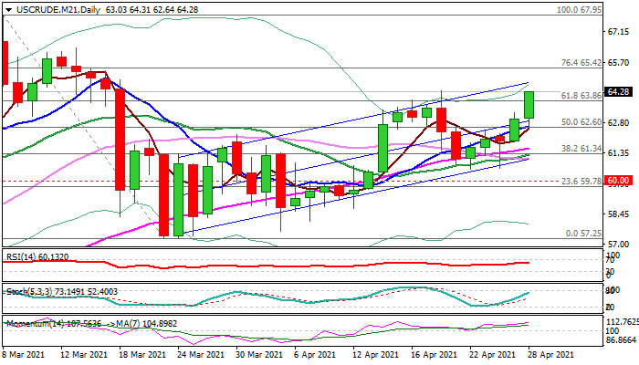 Rising positive momentum and daily moving averages in bullish setup support the action., which pressures last week’s spike high ($64.35), with break higher to expose $65.00 (round-figure) and $65.42 (Fibo 76.4% of $67.95/$57.25).