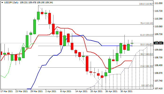 The dollar stands at the front foot on Wednesday and eyes cracked pivot at 109.63 (Fibo 61.8% of 110.96/107.47), where bull-trap was formed on Monday that still weigh on the action.