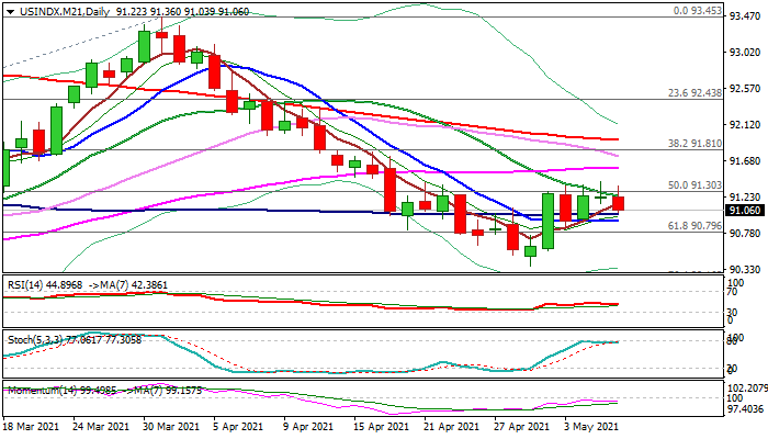 Daily momentum studies remain negative while stochastic is hovering around the border of overbought territory, adding to signals of recovery stall.