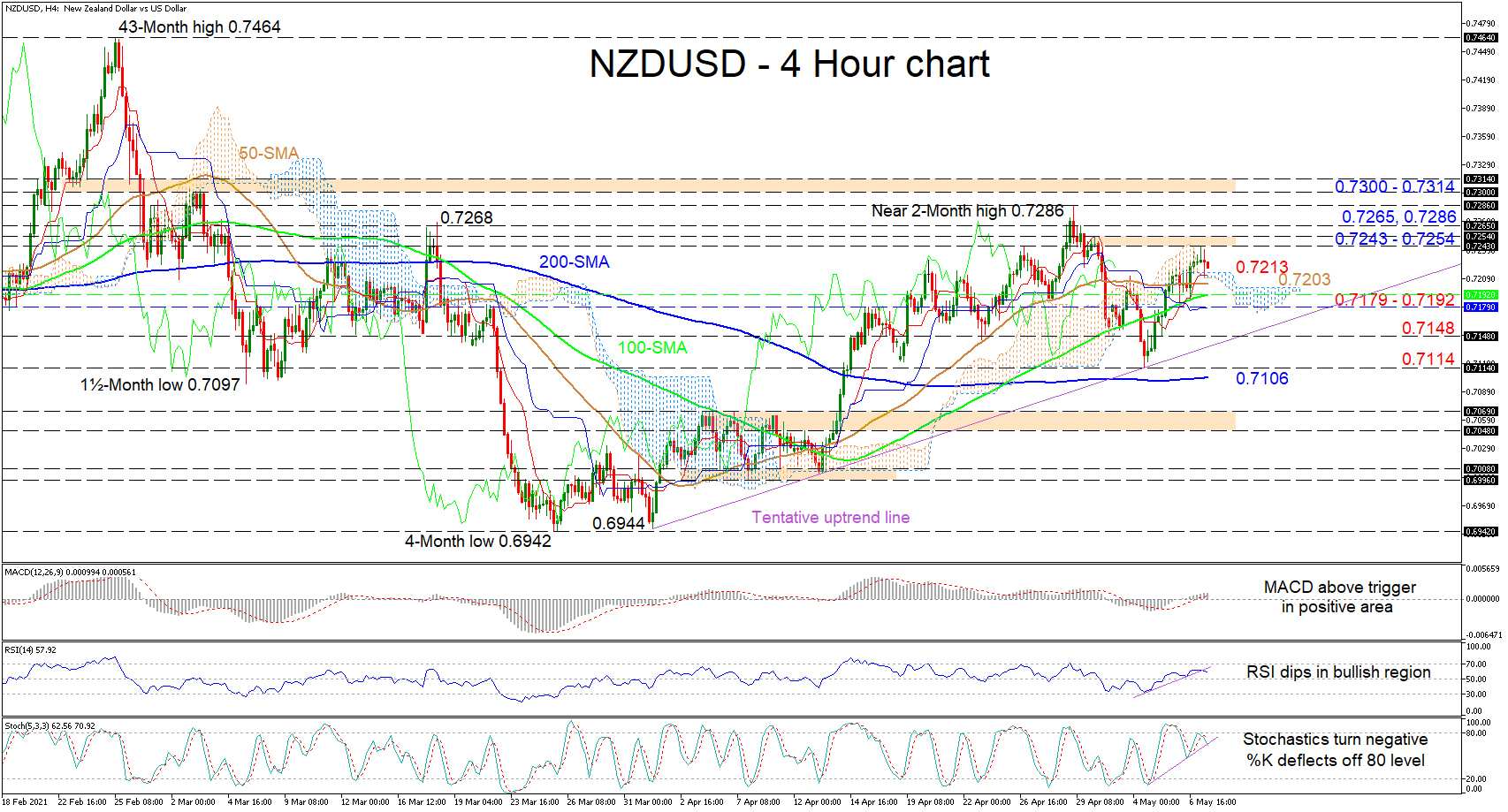 If the minor recoil in the price matures below the Ichimoku cloud and the red Tenkan-sen line around 0.7213, early support could arise from the flattening 50-period SMA at 0.7203. Dipping lower, a region from the 100-period SMA at 0.7192 until the blue Kijun-sen line at 0.7179 could impede the price from losing extra ground. The next defence of the gradual climb in price from the 0.6942 trough lies at the short-term uptrend line, somewhere in-line with the 0.7148 barrier. Yet, should sellers break below this diagonal line, the 0.7114 trough and adjacent 200-period SMA at 0.7106 may try to terminate the decline.