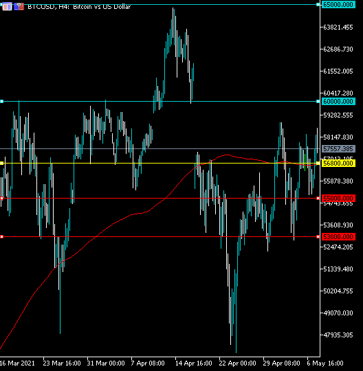 The BTCUSD pair is only bullish while trading above the $56,800 level, key resistance is found at the $60,000 and the $65,000 levels.