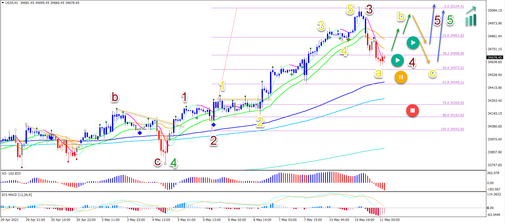 On the 1 hour chart, price action seems to have completed a 5 wave pattern (gold) in the wave 3 (brown) at the $35,000 round resistance level. Let’s review what to expect next: