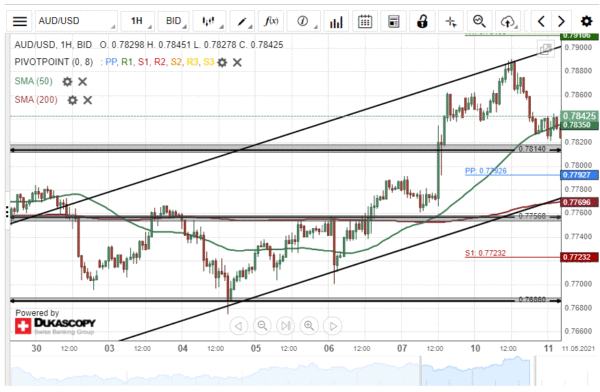 Currently, the AUD/USD exchange rate is trading near the 50– hour SMA at the 0.7832 level.