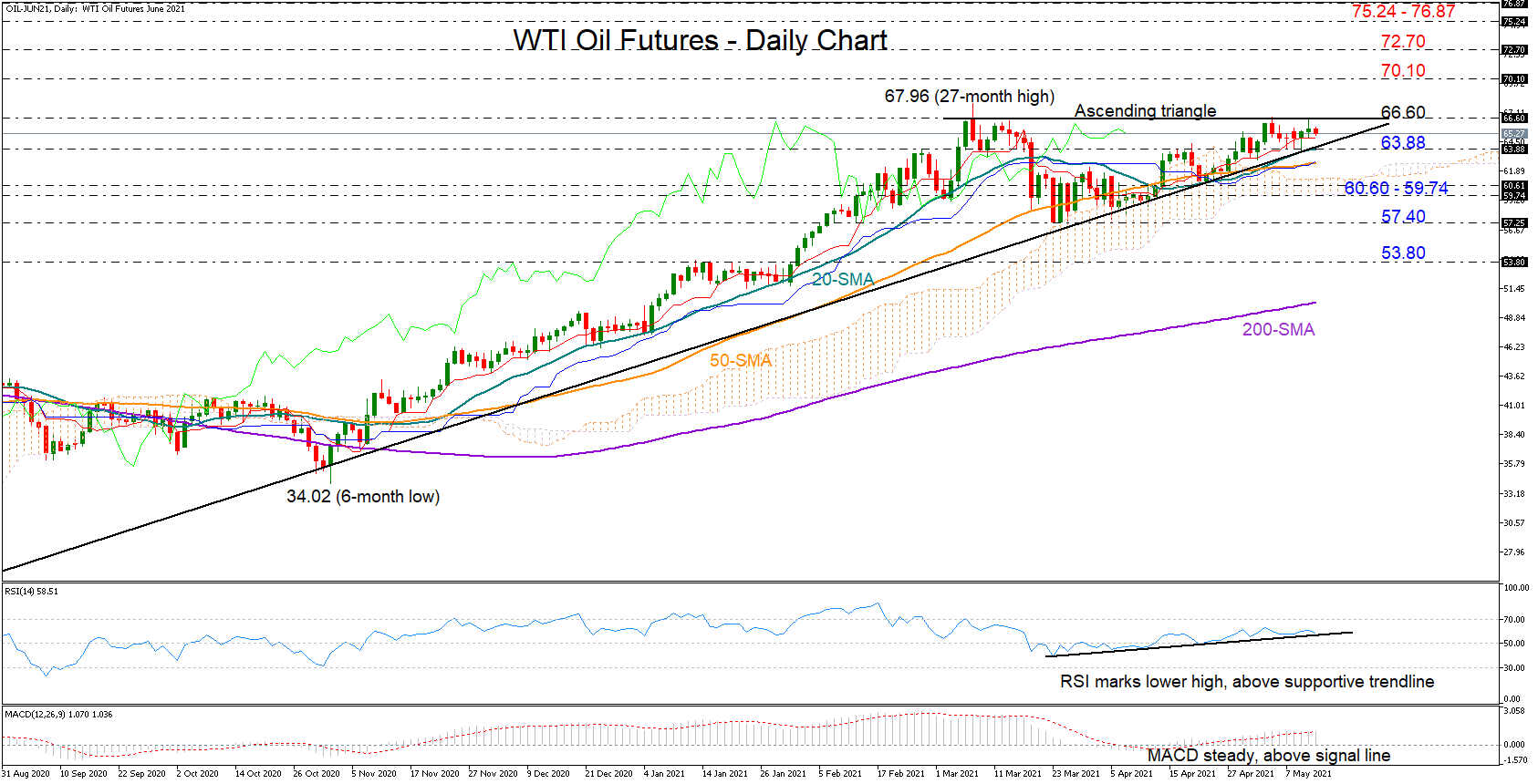 WTI oil futures for June delivery could not find enough buyers to breach the heavy resistance around 66.60 on Wednesday. But that ceiling looks now to be a part of a large ascending triangle – a positive signal that the paused one-year-old uptrend could soon resume.