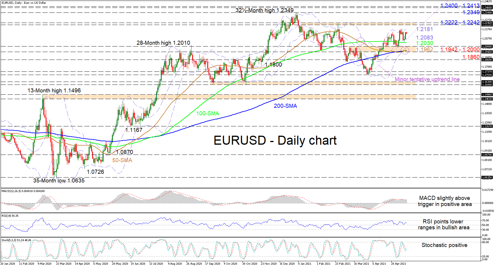 Despite mixed signals in directional momentum, the short-term oscillators seem to be tightening downside defences that lie between the mid-Bollinger band and the 100-day SMA. The MACD, in the positive region, is persisting above its red trigger line, while the ranging RSI is struggling to strengthen in the bullish territory. The stochastic oscillator has reclaimed a positive charge and is promoting optimistic developments in the pair.