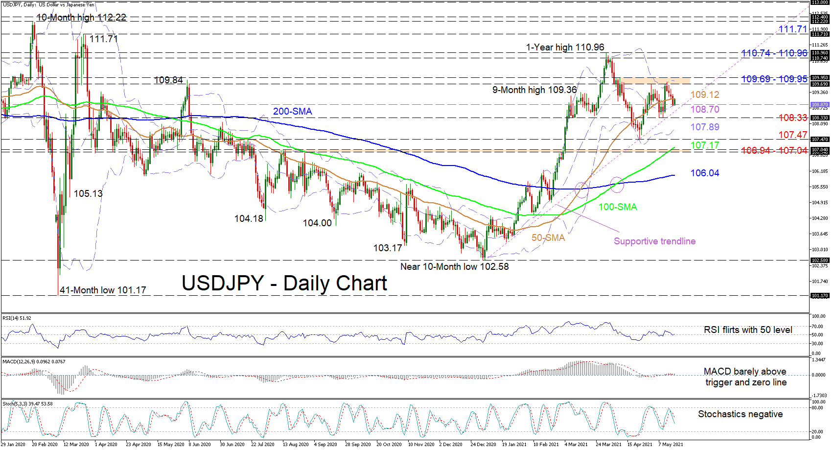 If the pair successfully forms a strong foothold off the mid-Bollinger band at 108.87 and oversteps the 50-day simple moving average (SMA) at 109.12, tough upside constraints may originate from the 109.69-109.95 section, which also contains the upper Bollinger band. Navigating beyond the 110.00 handle could then propel the price towards a durable area of resistance between the 110.74 barrier and the 1-year high of 110.96. Triumphing over this too could encourage buyers to challenge the 111.71 peak, reached in March 2020.