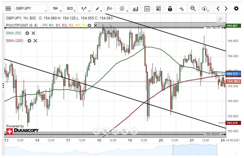 The British Pound edged lower by 58 pips or 0.37% against the Japanese Yen on Friday. The currency pair breached a support cluster at the 154.20 level during Friday’s trading session.