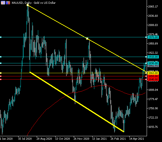 XAUUSD is only bullish while trading above the $1,860 level, key resistance is found at the $1,890 and the $1,910 levels.