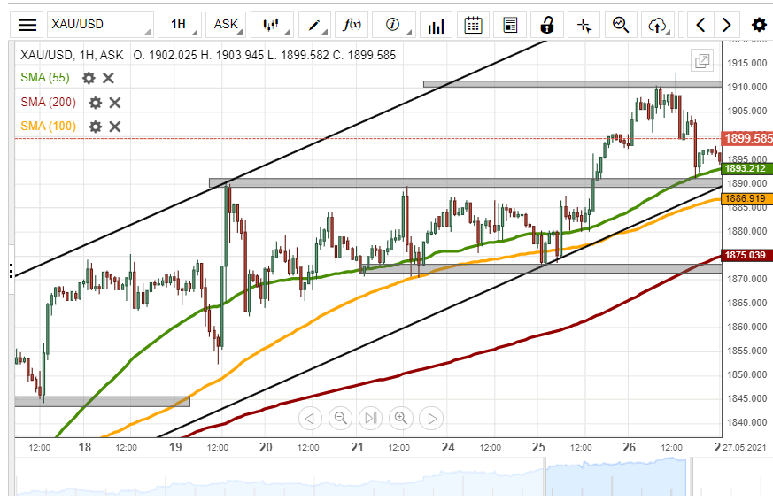 If the breakout occurs, a decline towards the 200– hour simple moving average at 1875.3 could be expected today.