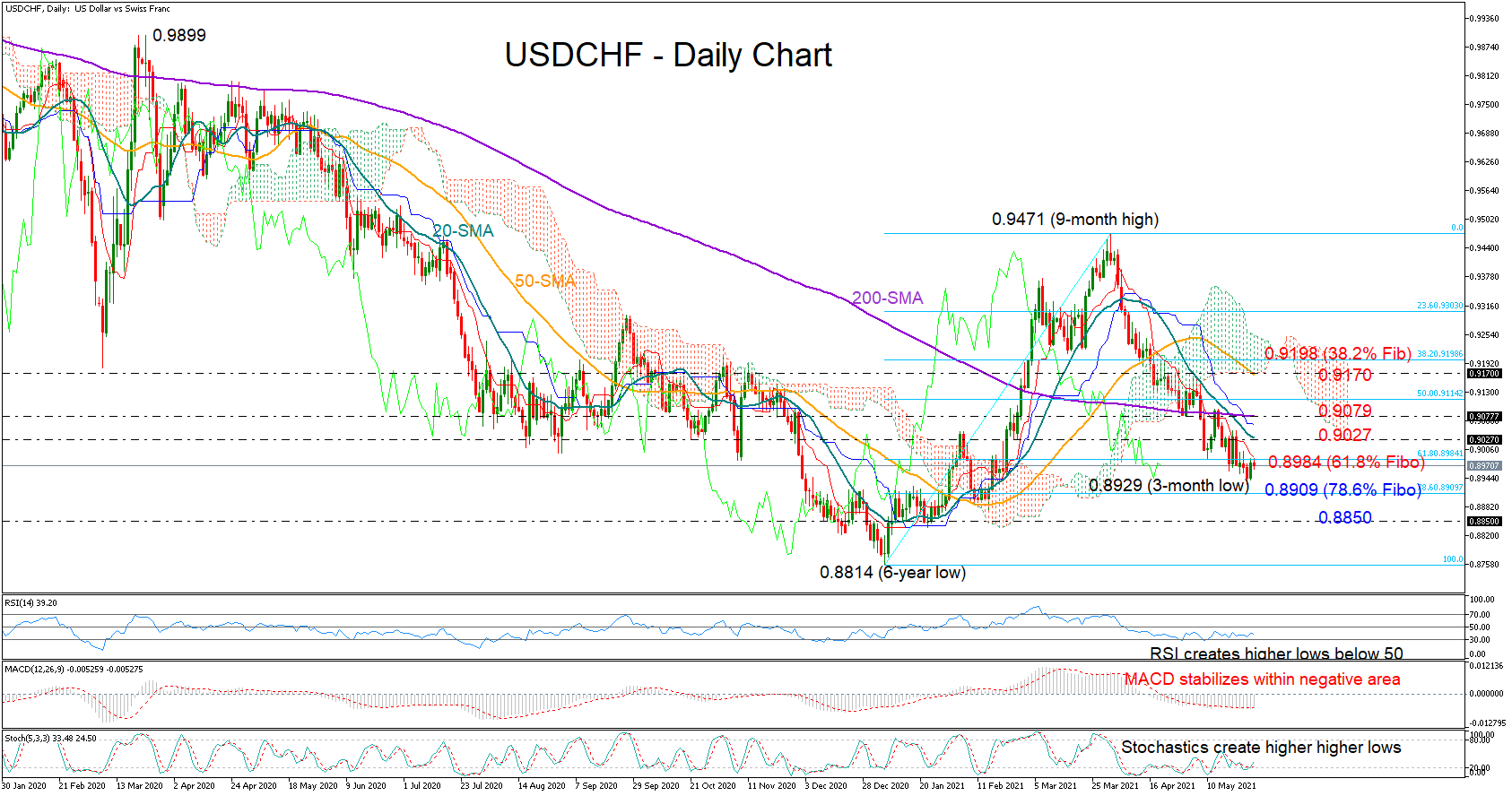 USDCHF has erased a large part on the January – March rally, with the price extending its downtrend to a 3-month low of 0.8929 this week.