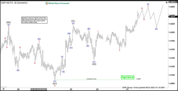 Short term Elliott Wave view in GBPUSD suggests that the rally from 4.12.2021 low unfolded as an impulse Elliott Wave structure. Up from April 12 low, wave 1 ended at 1.423 and wave 2 pullback ended at 1.4089. Internal subdivision of wave 2 unfolded as a zigzag Elliott Wave structure. Down from wave 1, wave ((a)) ended at 1.411 and wave ((b)) bounce ended at 1.4211. Pair then resumes lower in wave ((c)) which ended at 1.4089. This completed wave 2 in higher degree.
