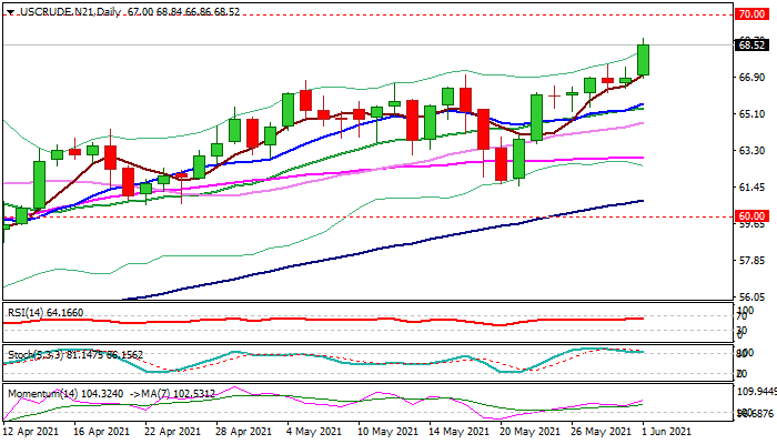 Fresh bulls came ticks ahead of $69 round figure barrier and turned focus towards psychological $70 level, with firmly bullish studies on all larger timeframes being supportive, however overbought conditions may produce headwinds and pause bulls for price adjustment.