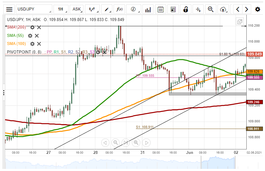 If the USD/JPY passes the resistance of the 110.00 and 110.20 levels, the pair could reach the 110.50 mark and the weekly R1 simple pivot point at 110.55.