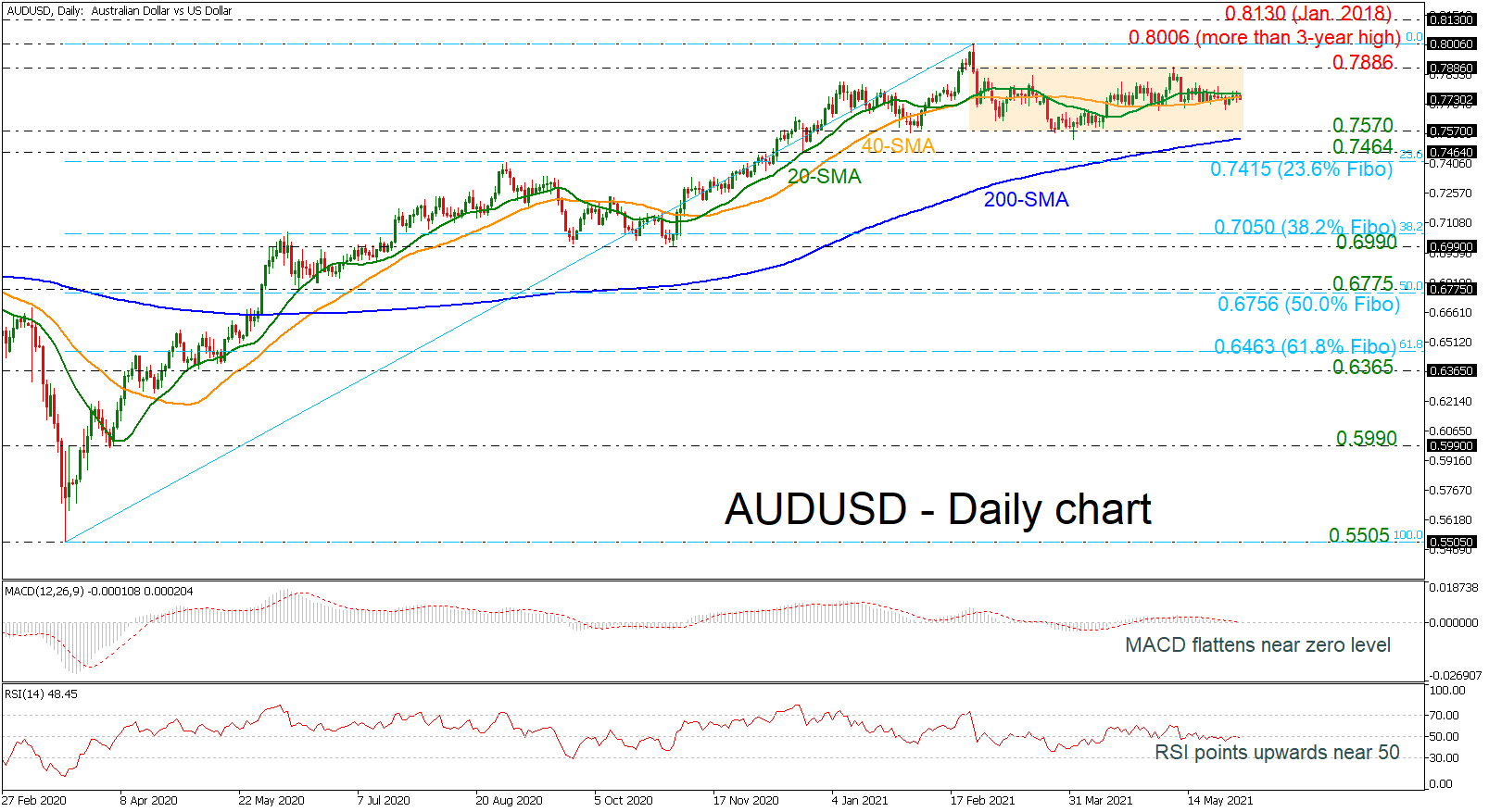 AUDUSD has been moving within a horizontal trajectory over the last three months, remaining near the 20- and 40-day simple moving averages (SMAs). However, the 200-day SMA is still moving higher, approaching the current market price. The RSI, around the 50 neutral level, is heading south, while the MACD oscillator is failing to strengthen its movement, holding near the zero level in the short-term.