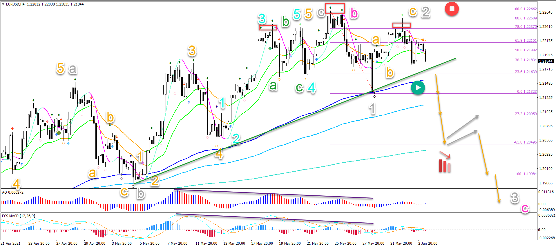 - The EUR/USD is expected to make a full bearish price swing in wave C (pink) after completing a bullish wave B.