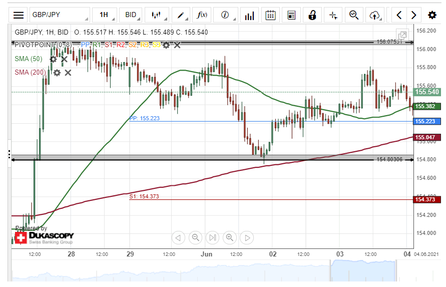 The exchange rate is currently trading near a support level formed by the 50– hour SMA at 155.38.