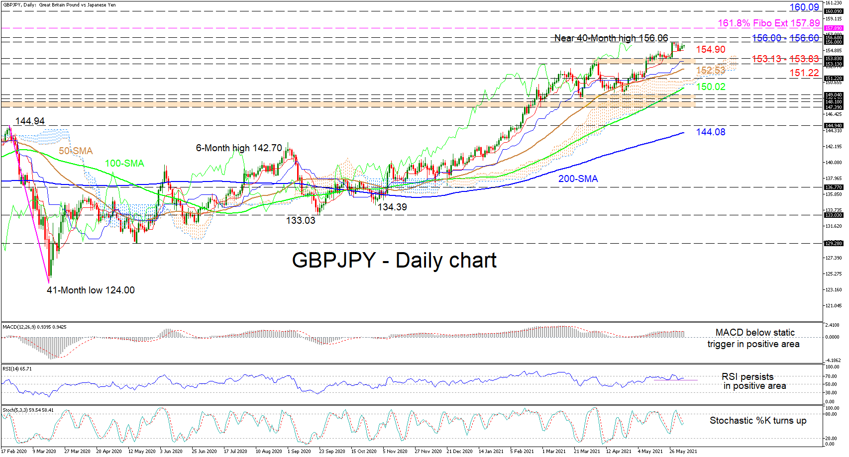 GBPJPY has temporarily ceased its bullish bearing at a resistance belt, moulded between the 156.00 hurdle and the peak of February 2018 at 156.60. Nonetheless, the climbing simple moving averages (SMAs) are endorsing the broader bullish structure, while the Ichimoku lines are conveying that the positive drive in the pair remains fairly intact.
