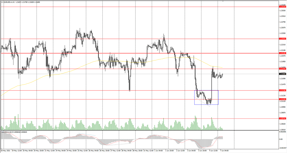 The price has quickly returned to the moving average line, and the MACD indicator is in the positive zone again. The uptrend is likely to resume, but only if the price breaks out through the priority change level of 1.2112. Under such market conditions, traders are better to look for both sell trades from the nearest resistance levels and buy trades from support levels within the upward momentum.