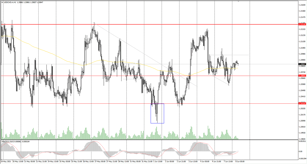 The USD/CAD currency pair formed a narrow flat in the middle of a wider corridor with the range OF 1.2032-1.2137. At the same time, the price is trading near the moving average, which makes it difficult to find good entry points on the H1 timeframe.