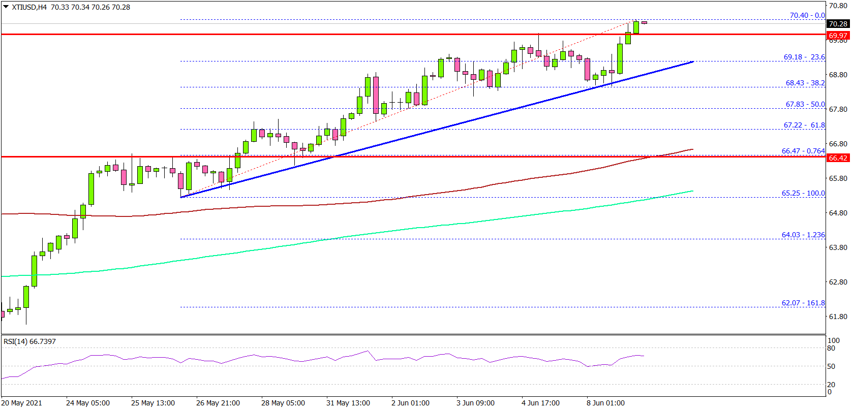 Finally, there was a break above the $70.00 level. The price traded to a new multi-month high near $70.40 and it is now consolidating gains. An initial support on the downside is near the $70.00 level.
