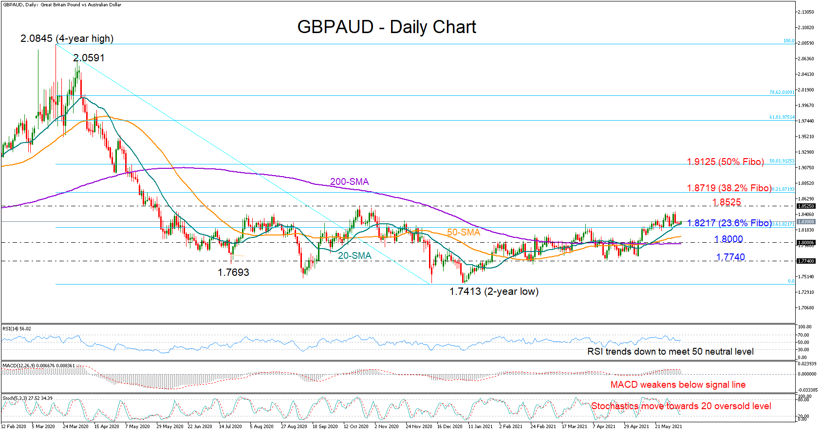Otherwise, should the 20-day SMA prove to be fragile, letting the pair slip below the 23.6% Fibonacci of 1.8217 too, traders could look for support near the 1.8000 round-level, where the 200-day SMA resides as well. If sellers persist, the spotlight will turn to the crucial floor of 1.7740, a break of which may pressure the price straight to the two-year low of 1.7413.