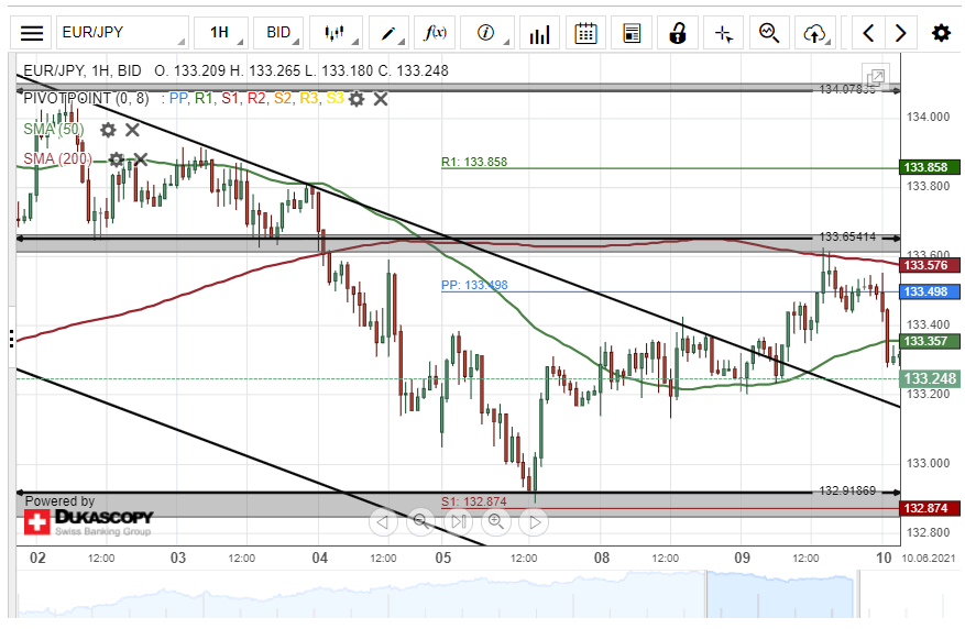 Given that a breakout has occurred, bullish traders are likely to drive the exchange rate higher during the following trading session. The potential target for the EUR/JPY currency pair will be near the weekly resistance level at 133.85.
