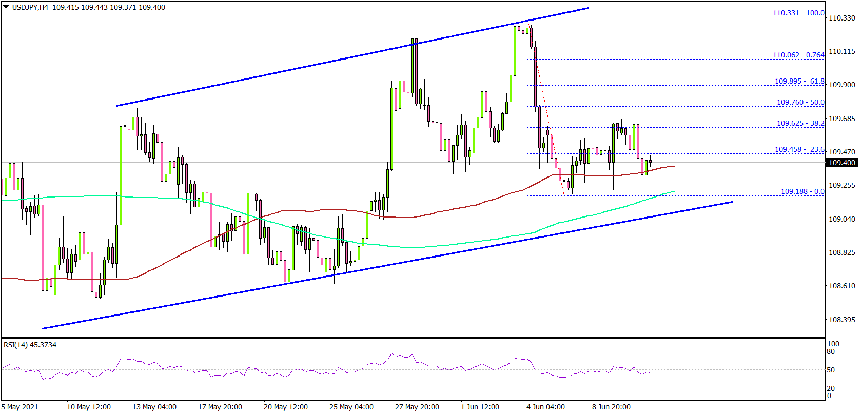 - A key rising channel is in place with support near 109.10 on the 4-hours chart.