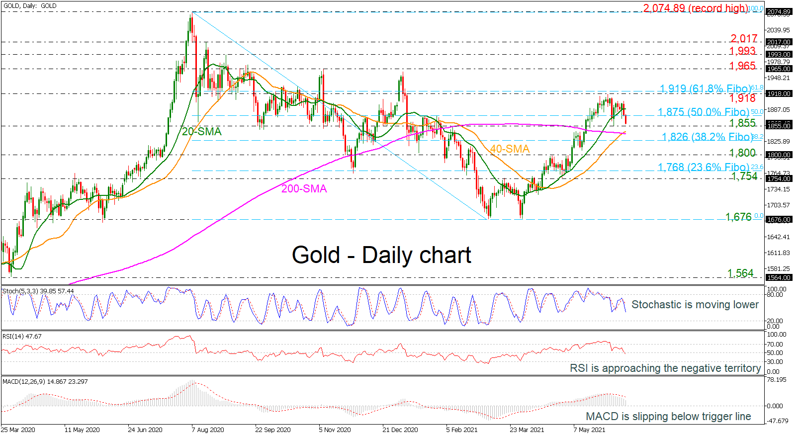 In case the bears drive the market beneath the 1,855 support and the bullish crossover within the 40- and 100-day SMAs, the 38.2% Fibonacci retracement level of 1,826 may halt the declining move. Steeper decreases could open the door for the 1,800 handle ahead of the 23.6% Fibonacci of 1,768.