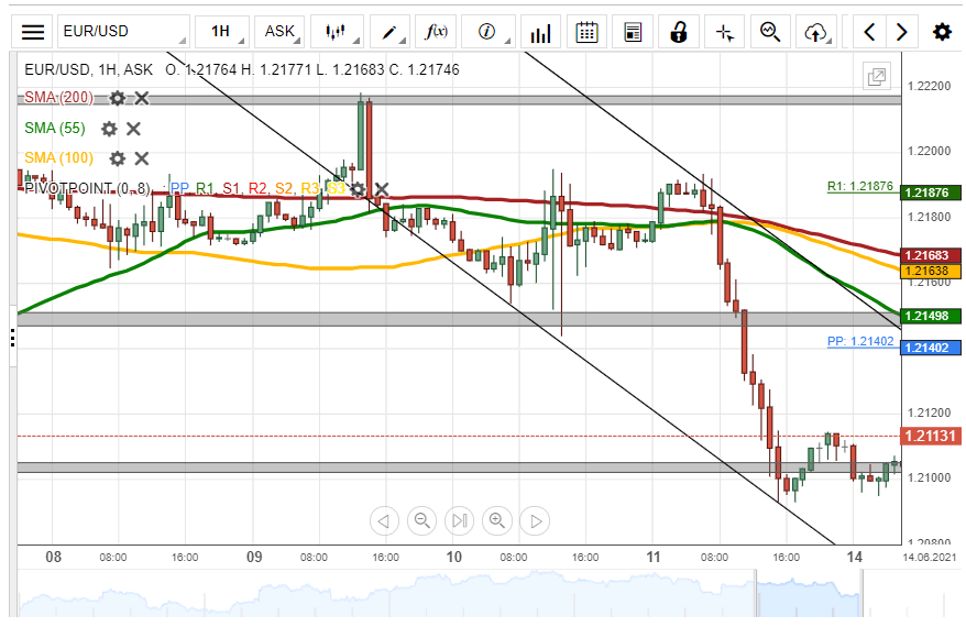 On Monday morning, the EUR/USD started the week’s trading by fluctuating near the 1.2100 mark. Note that the Friday’s drop passed the support of the June low level and reached below the 1.2100 level. Due to that reason, an extension of the decline is possible.
