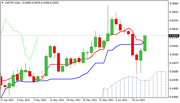 The USDTRY advances for the second straight day after the pullback from new record high (8.7536) lost power on approach to thick rising daily cloud (cloud top lays at 8.20), with double failure at 55DMA (8.2781) and subsequent bounce, signaling bear-trap.