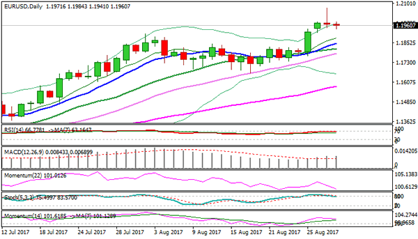 Extension of strong three-day bullish acceleration from 1.1773 trough peaked at 1.2070 on Tuesday, but probe above psychological 1.2000 target proved to be short-lived, as close of Tuesday’s trading occurred below 1.2000 handle after traders booked profits.