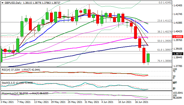 Daily indicators turned north deeply in the negative territory and support the bounce, which faces resistance from thickening daily cloud (1.3917/1.3960) ahead of broken psychological 1.40 barrier, where rebound should stall to keep fresh bears in play.