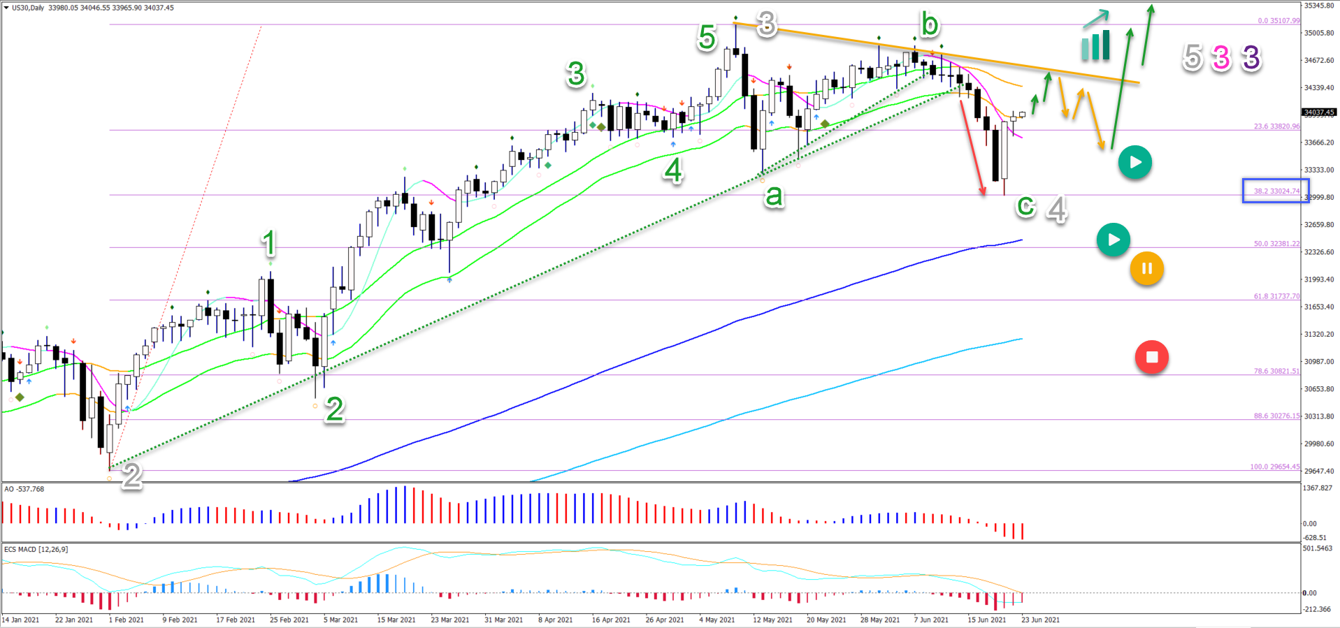 - US 30 (Dow Jones Index) daily chart made a bearish pullback and bullish bounce at the 38.2% Fib – as expected in our previous Elliott Wave analysis.