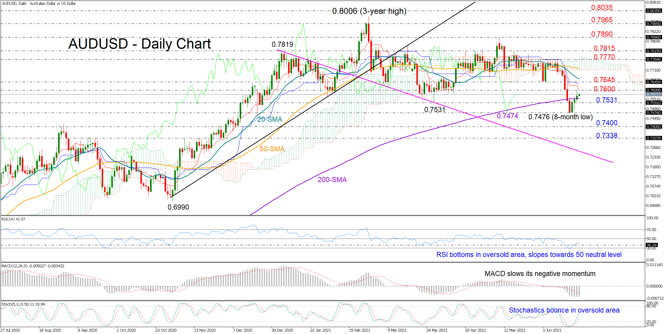 AUDUSD has been on a recovery mode this week, slowly erasing the slump to an eight-month low of 0.7476, which shot the price out of the 0.7531 – 0.8006 range area and put the market in a soft downward path.