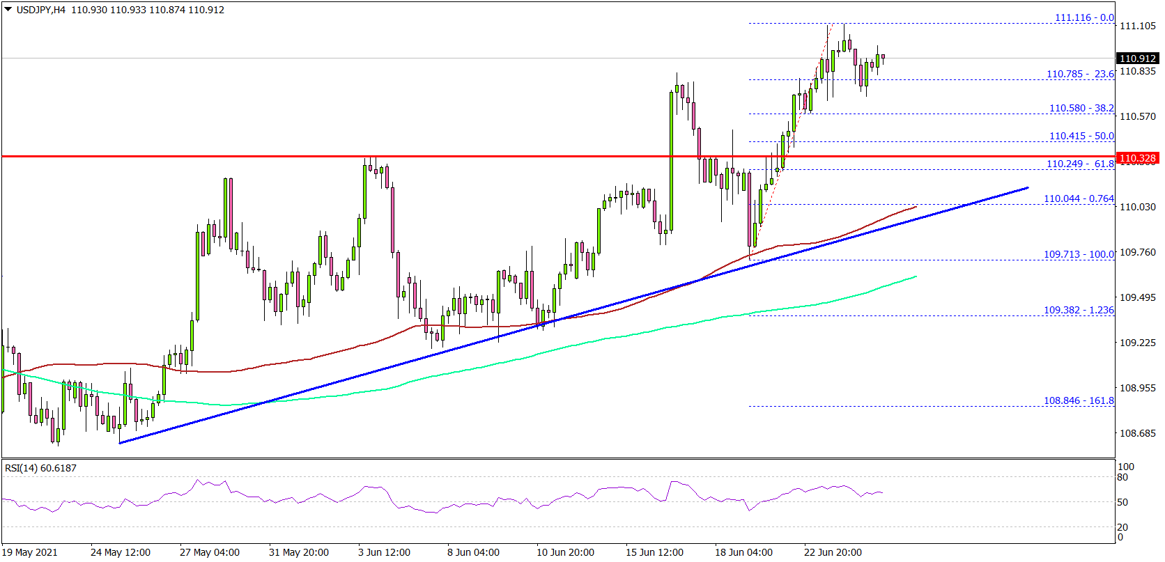 - A key bullish trend line is forming with support near 110.00 on the 4-hours chart.