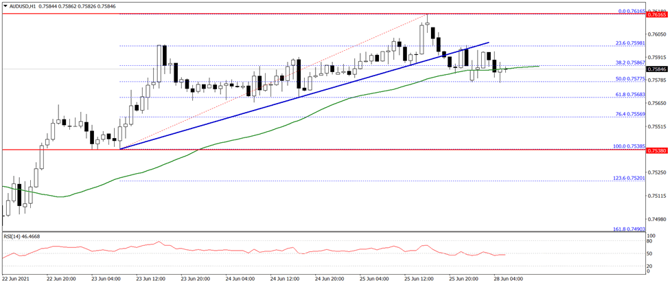 There was a break below the 0.7600 support level. Besides, the pair traded below a key bullish trend line with support near 0.7590 on the hourly chart. It is now consolidating near 0.7585 and the 50 hourly simple moving average.