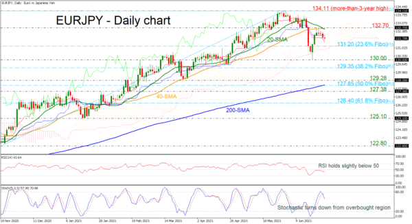 EURJPY posted three consecutive red days below the 132.70 restrictive area; however, the rebound off the 130.00 psychological level is still in place. The 20- and 40-day simple moving averages (SMAs) have completed a bearish crossover, acting as strong resistance for the bulls. The RSI is mirroring the price action, moving sideways beneath the 50 level, while the stochastic is turning lower from the overbought region.