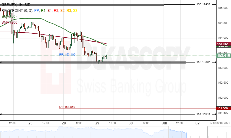 The GBP/JPY pair is currently trading near a support level at 153.19. If the support line holds, the exchange rate could target the 155.00 area within the following trading session.
