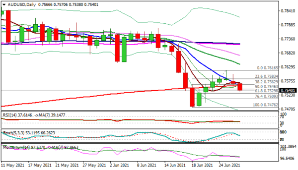 Bears eye pivotal Fibo support at 0.7529 (61.8% of 0.7476/0.7616 upleg), loss of which would confirm reversal and open way towards key supports at 0.7476 (June 18 low) and 0.7445 (top of thick ascending weekly cloud) where bears could faces strong headwinds.