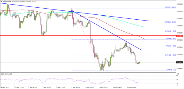 A successful close above 0.7620 and the 100 SMA could start a steady increase. If not, there is a risk of more losses below the 0.7500. The next key support is near 0.7480, below which the pair could revisit the 0.7400 zone.