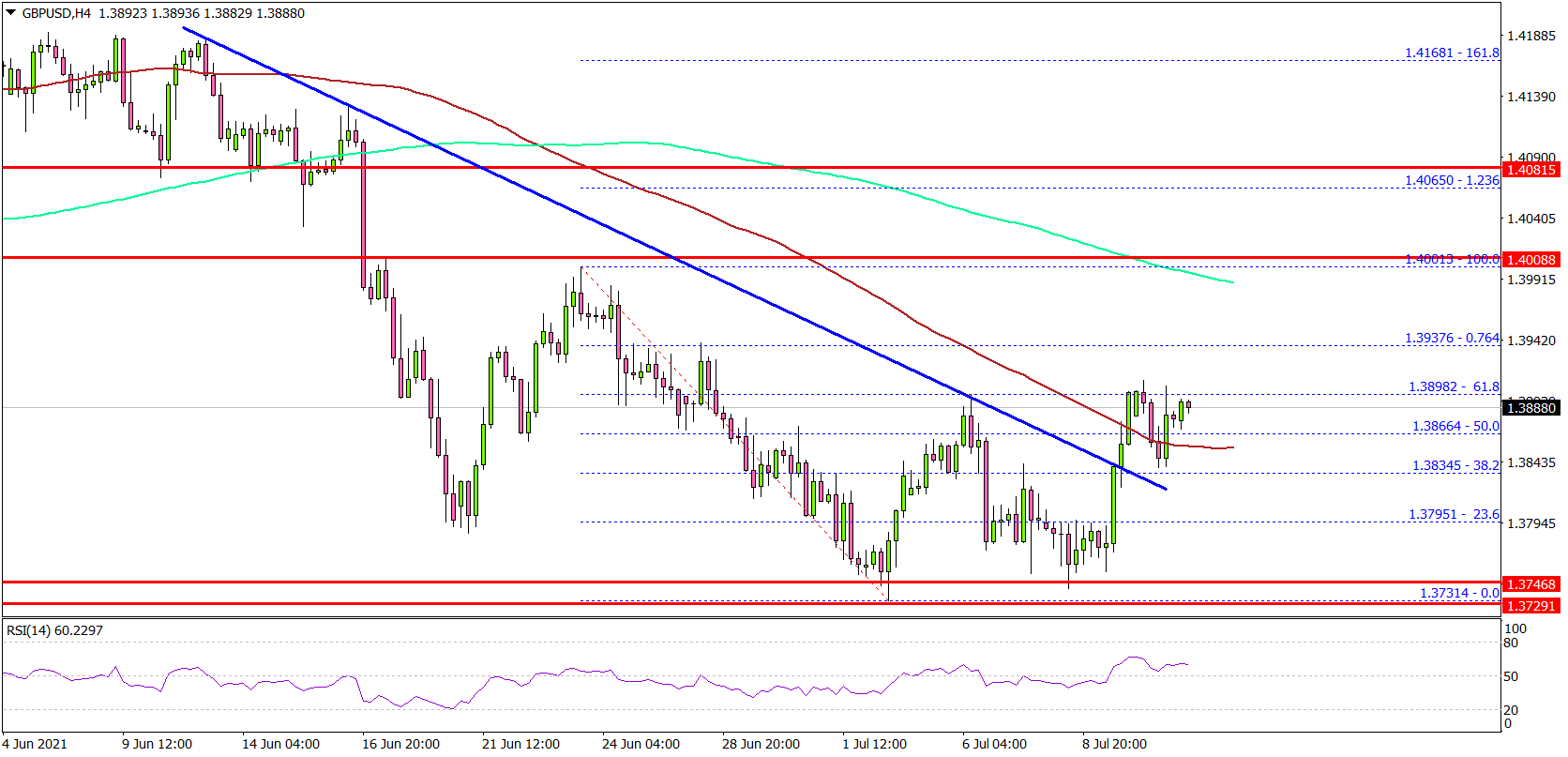 - GBP/USD found support near 1.3740 and recovered above 1.3850.